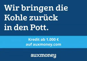 Bei auxmoney ist noch lange nicht Schicht im Schacht. Denn wir bringen die Kohle zurück in den Pott – ganz einfach übers Internet. Wenn Du schnell und unkompliziert Geld benötigst, bist Du bei auxmoney genau richtig. Ganz ohne Papierkram kannst Du innerhalb von wenigen Minuten Deinen Sofortkredit beantragen.