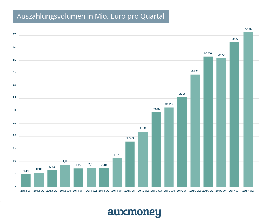 Bemerkenswert ist nicht nur die absolute Höhe des bislang ausgezahlten Volumens beim Fintech-Unternehmen aus Düsseldorf, sondern auch sein dynamisches Wachstum. So wurde knapp die Hälfte des Gesamtvolumens allein in den vergangenen zwölf Monaten ausgezahlt. Die Zahlen für das erste Halbjahr 2017 unterstreichen diese Dynamik: Das ausgezahlte Kreditvolumen lag von Januar bis Juni bei 135 Millionen Euro; gegenüber den 79,5 Millionen Euro aus dem ersten Halbjahr des Vorjahres entspricht das einem Zuwachs von 70 Prozent.