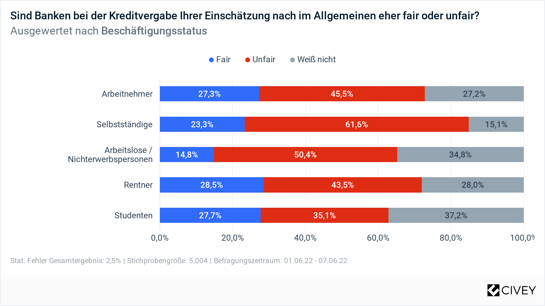 - Besonders Selbstständige unzufrieden: 61,6 Prozent empfinden Kreditvergabe durch Banken als unfair